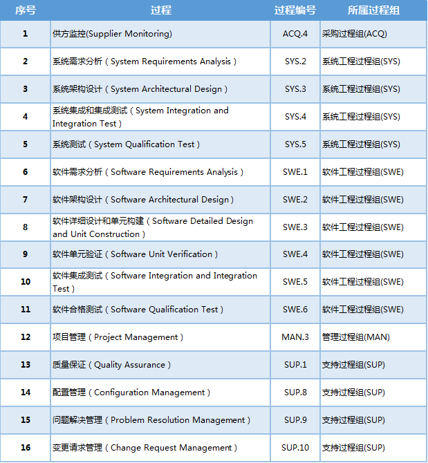 在實施ASPICE過程中,并非32個過程均需要實施,通常根據(jù)廠商的要求選擇過程實施,在ASPICE 3.1版本中,模型情況下,實施VDA范圍的16個過程,如下表: